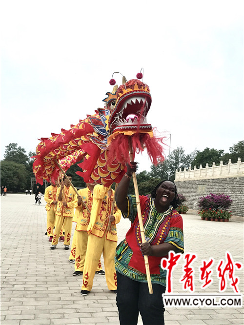來自坦桑尼亞的外籍記者興奮地參與“舞龍”