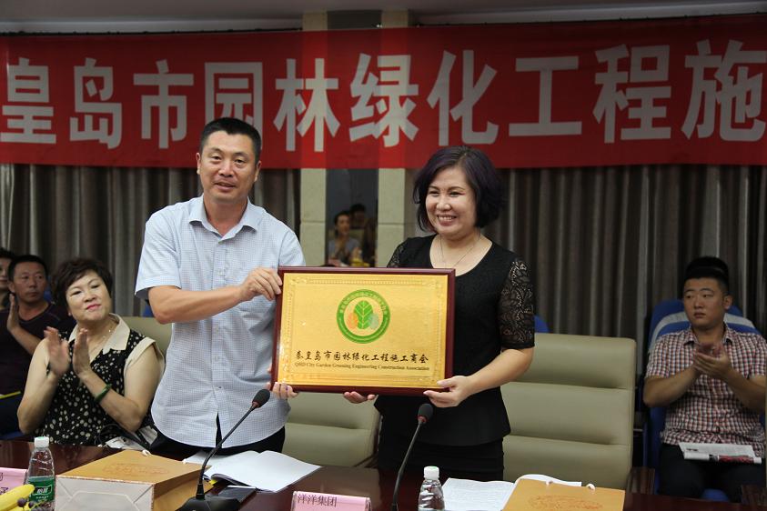 市民政局行政審批科科長李占勇為秦皇島市園林綠化工程施工商會頒牌