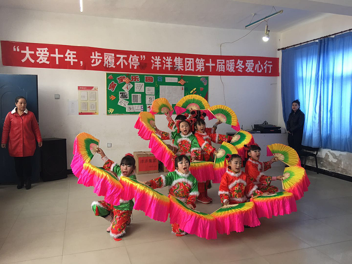 他們是祖國的未來、民族的花朵、洋洋的孩子,愛心捐贈是一項公益性活動,十年來洋洋集團與旗下員工、商戶一直關心著學校建設和學生的成長,一年一次的暖冬活動已經形成了大家的一項共同事業,當大家與學生們在一起交流互動時,我們看到了孩子們的期盼,我們內心受到了促動,更感到了那份欣慰。校領導告訴我們九年前洋洋集團捐助的第一批學生現在已經升至初四,明年就要參加中考了,在這些洋洋希望小學的學子中有三名孩子的成績在全縣排名均名列前茅,我們內心充滿著自豪與感動。
