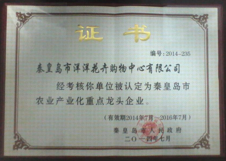 洋洋花卉、購物中心雙雙榮獲秦皇島市農業產業