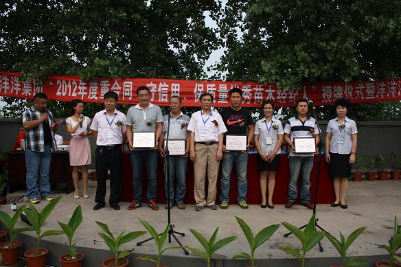 第一項:授予“江蘇省新沂市松竹梅花木有限公司嚴炳權先生”、“山東濟寧任城區(qū)農大苗木種植場李文營先生”、“遼寧省撫順市立哲苗木基地李春利先生”、“秦皇島市撫寧縣牛頭崖鎮(zhèn)王各莊村廣士苗圃園李海波先生” “洋洋集團2012年度重合同、守信用、保質量優(yōu)秀苗木經(jīng)濟人”榮譽稱號。